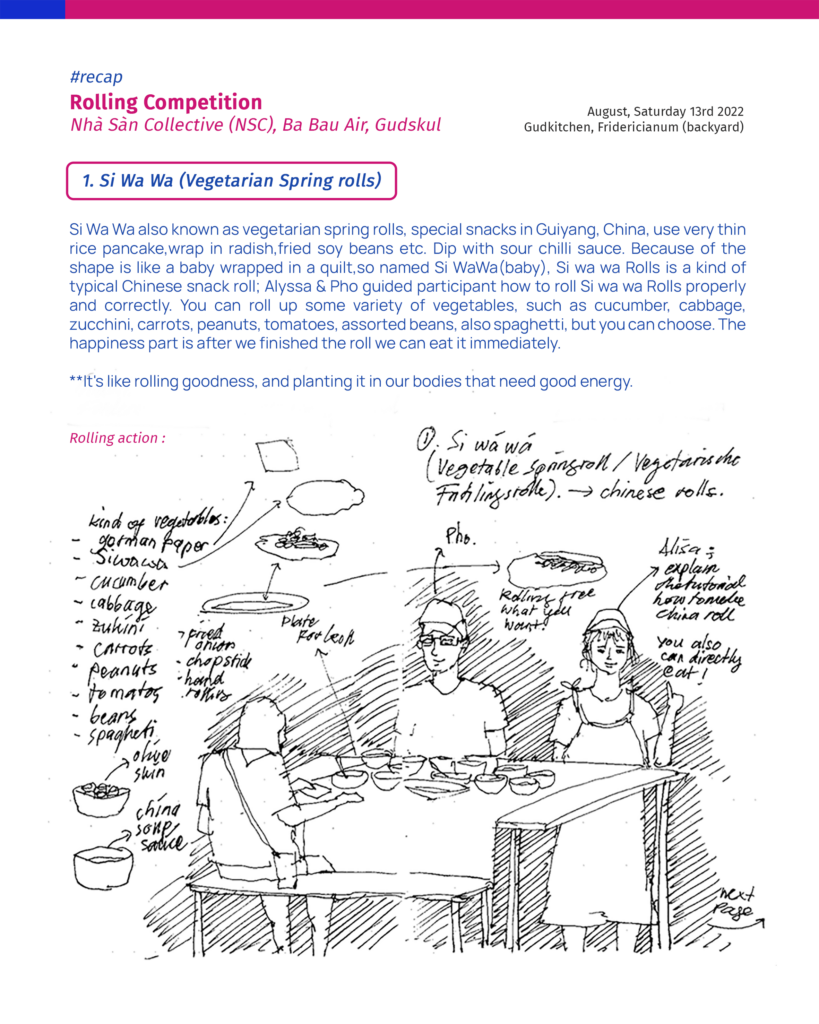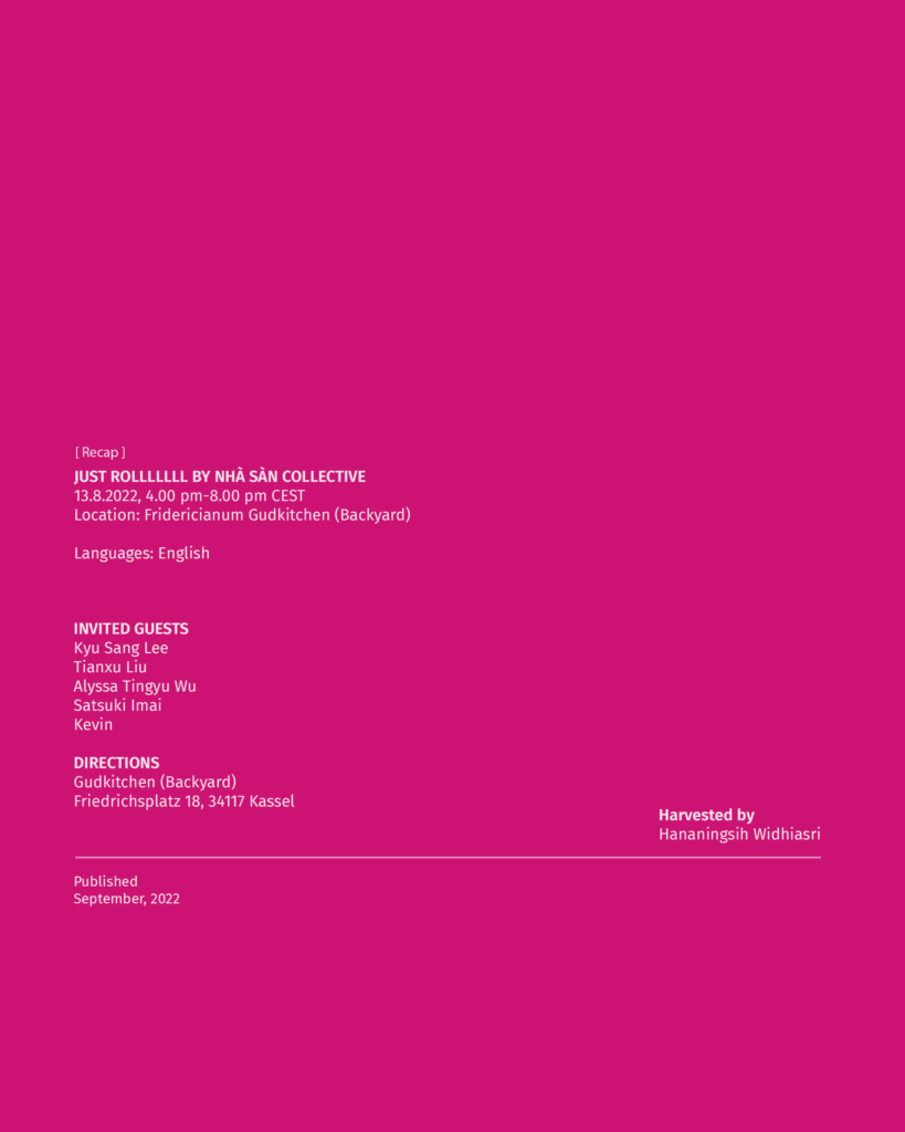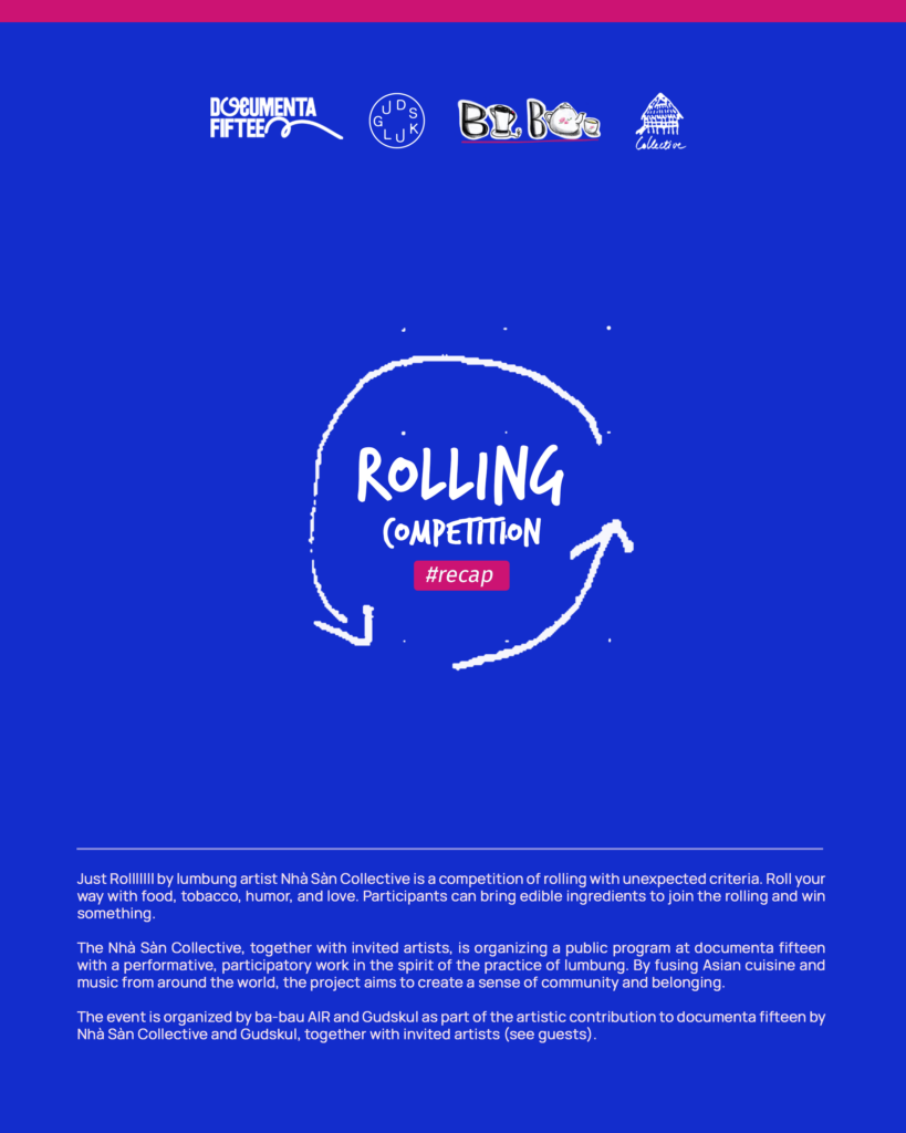 Just Rolllllll by lumbung artist Nhà Sàn Collective is a competition of rolling with unexpected criteria. Roll your way with food, tobacco, humor, and love. Participants can bring edible ingredients to join the rolling and win something.