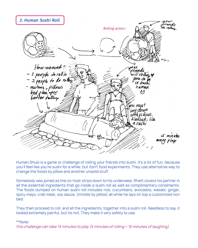 2. HUMAN SUSHI — Human Shusi is a game or challenge of rolling your friends into sushi. It’s a lot of fun, because you’ll feel like you’re sushi for a while, but itsn’t food experiments. They use alternative way to change the foods by pillow and another unsolid stuff.