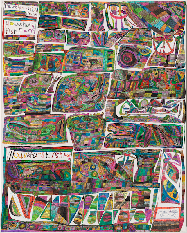 Image: Michelle Roberts, HawkHurst Fish Farm, 2024, pens on canvas, 152cm x 122cm