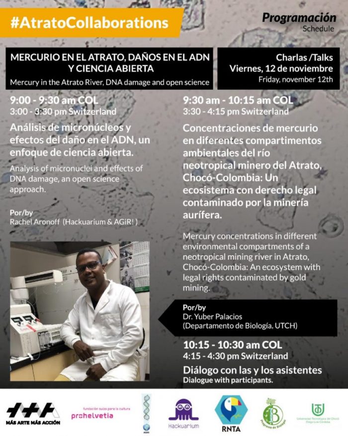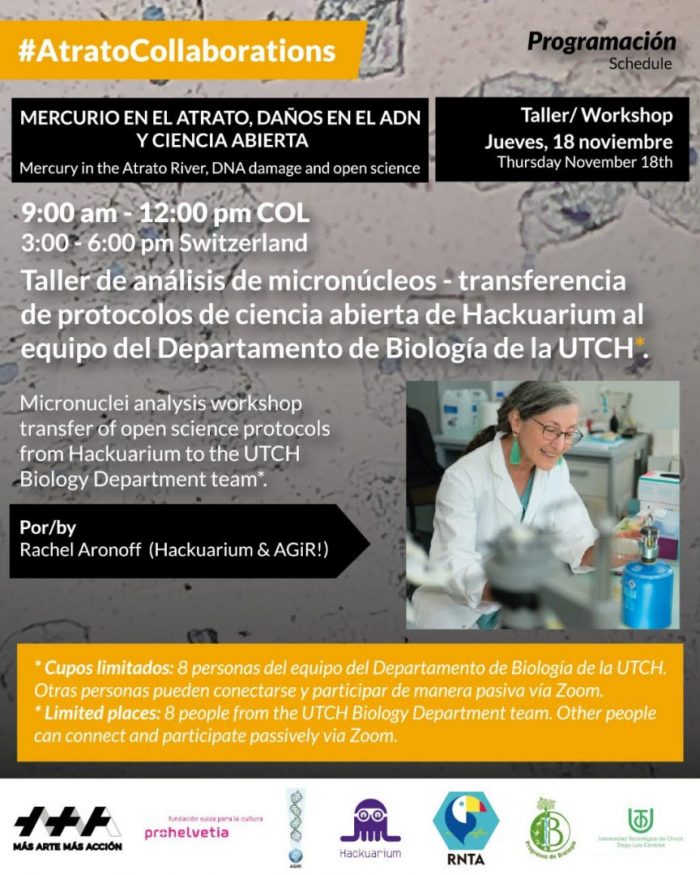 Rachel Aronoff linked Hackuarium’s expertise on open science with Quibdó’s science collectives through a series of talks, hoping to do a ‘Micronuclei Analysis’. “While wondering what this really means, and whether ‘bio’ gold certificates might actually fly (for the old-fashioned ‘panning’ for gold mining, as opposed to any operation, legal or illegal, that uses mercury to concentrate gold), Rachel hoped, before this Coronavirus season, to run a series of public ‘micronucleus’ workshops, to determine whether people observing DNA damage inside their own cheek cells would be prompted to take action to ensure more justice in the region.” While we are able to resume these workshops, Rachel will lead a series of talks around the microkernel proposal, the experience of creating a do-it-yourself ‘Coronavirus Detective’ and about Hackuarium’s open science and co-operative approach.
