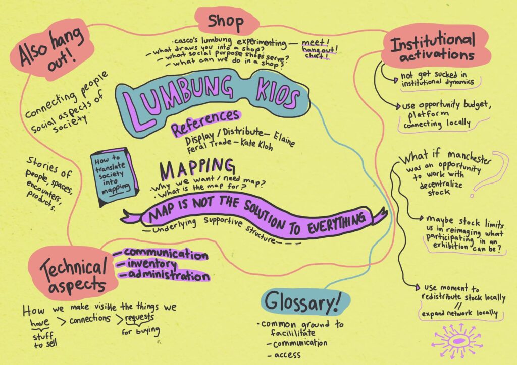 - how can we imagine lumbung kios if we centralize dissemination instead of selling? if we foreground the social instead of the sale? how does our participation in events look like if we decentralize stock? what could an invitation from an institution look like, or how do we renegotiate the invitation to serve the collective pot + local infrastructure?